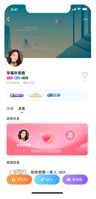 用户在个人主页可展示详细信息、亲密关系及荣誉称号;可直接送礼物、发消息。