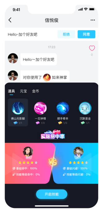 用户之间可以进行技能PK、技能消耗虚拟币,需要去道具商城购买道具兑换。