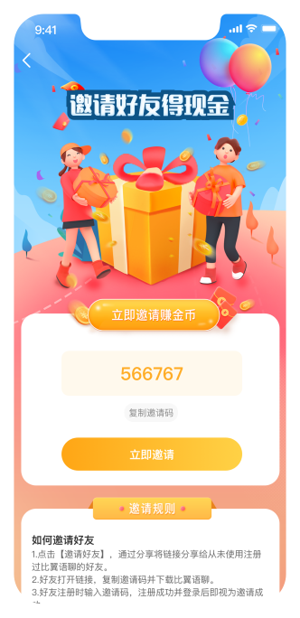 用户通过专属邀请码邀请好友使用软件后获得收益,促活拉新为平台获取流量。