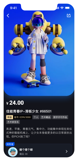 支持展示藏品详情信息及创作者简介,查看藏品历史交易记录,可限量发布藏品。