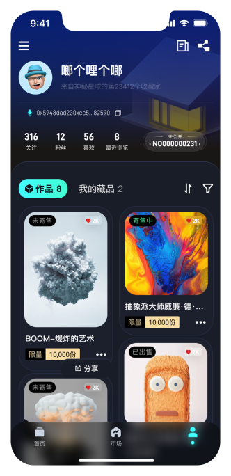 展示用户的个人信息,发布的藏品以及购买的藏品列表,支持按照分类筛选。