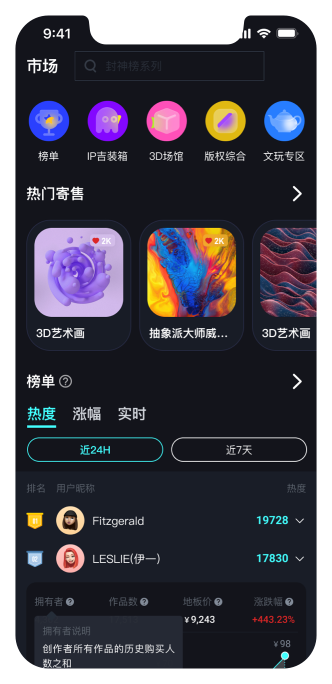 按照分类展示藏品列表,实时查看藏品涨幅、热度,专业的前端数据展示。