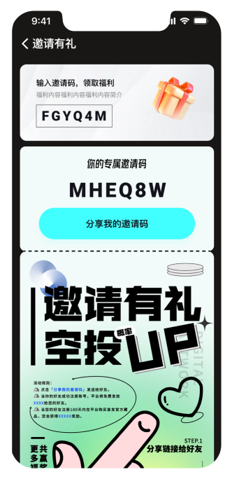 自动生成专属邀请码,复制分享给好友获得奖励,多种营销模式。